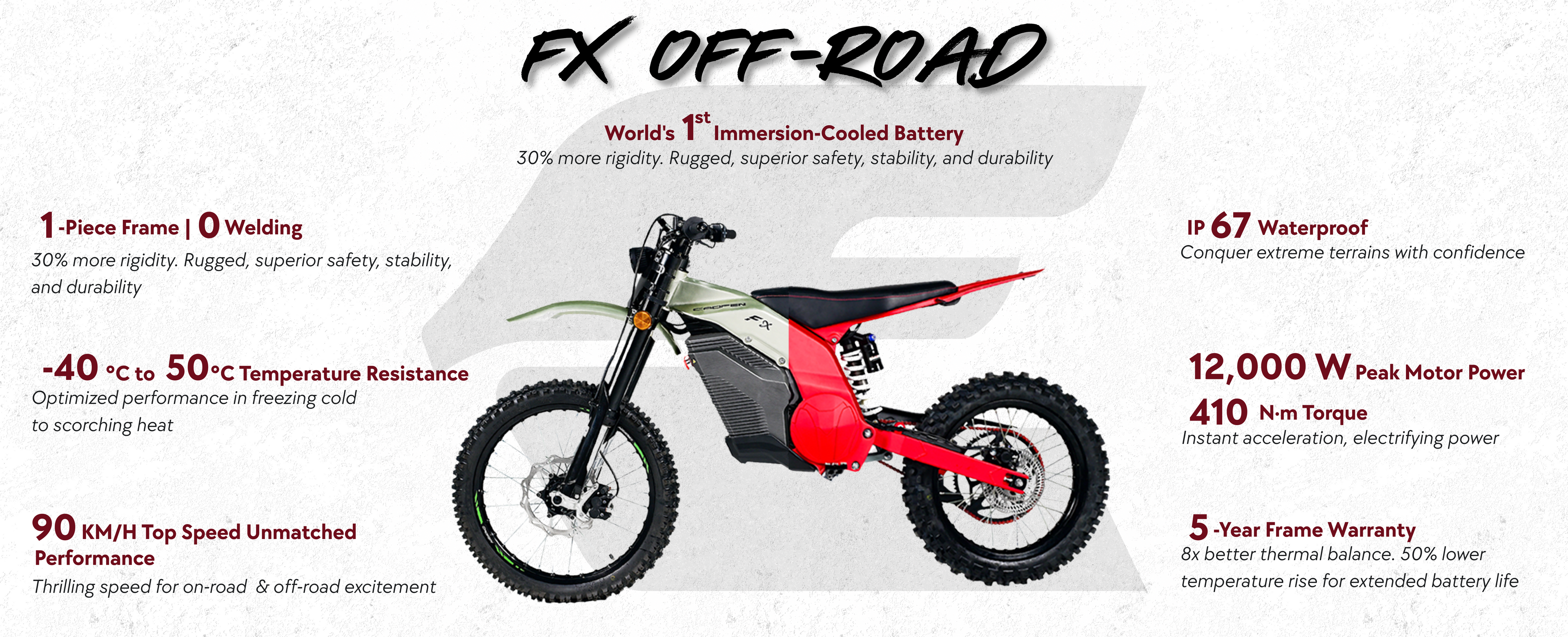 Embark on an exhilarating adventure with theCaofen FX Off-Road, celebrated for its robustframe and advanced battery technology. Witnessthe dominance of the trail-defying Caofen FX dirtbike, which surpasses the F80 in size, making itsuitable even for taller riders and providingenhanced comfort. Delve into the extraordinaryfeatures of the Caofen FX Off-Road, establishinga daring new standard for dirt bikes.